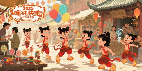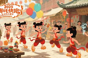 儿童节的哪吒闹“园”,阳光泼洒的操场上,孩童们化身“小哪吒”——彩绸系成混天绫,在风里翻飞;气球当作乾坤圈,笑闹着抛向云端。有的举着卡通水枪“水遁攻击”,有的踩着平衡车“脚踩风火轮”穿梭,银铃般的笑声震得树叶沙沙响。你追我赶间,谁的纸飞机掠过大拱门?那是“哪吒”的乾坤弓在发射快乐信号,每个毛孔都溢出无忌惮的欢腾,连空气都甜得冒泡泡。