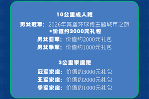 男/女冠军:2026年宾堡环球跑主题城市之旅+价值约3000元礼包