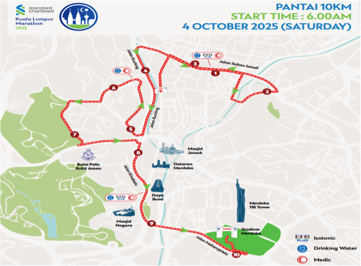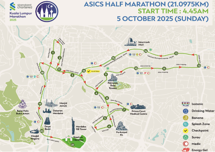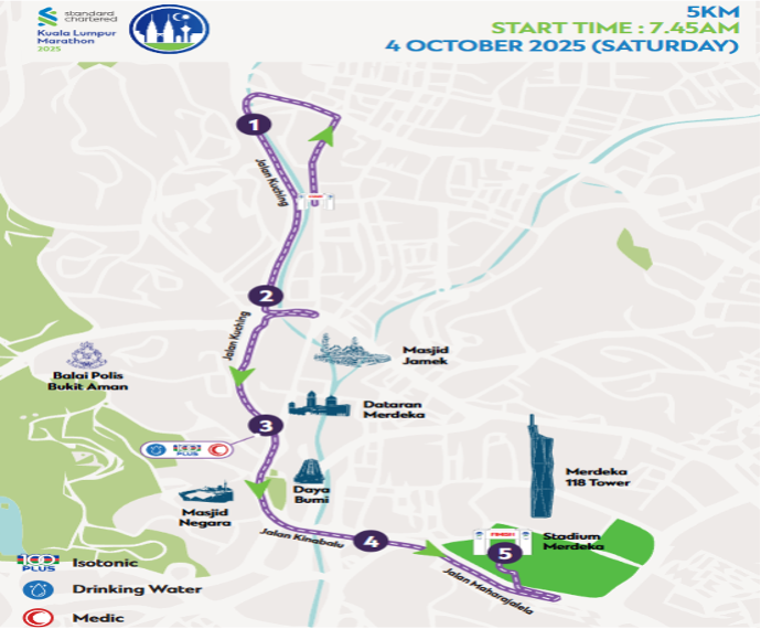 - 全马、半马、10公里、5公里、2公里均在拉惹劳特路(Jalan Raja Laut)