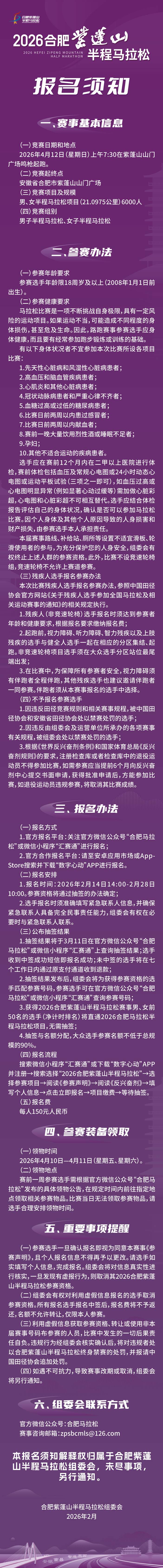(一)参赛选手一旦确认报名即视为同意本赛事《参赛声明》,且个人报名信息不得再予以更改。请选手如实填写个人信息,完成报名。组委会将对信息真实性进行核实,一旦发现有虚报行为,则取消其2026合肥紫蓬山半程马拉松参赛资格。