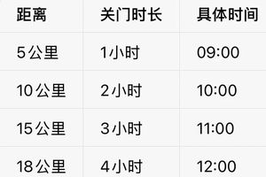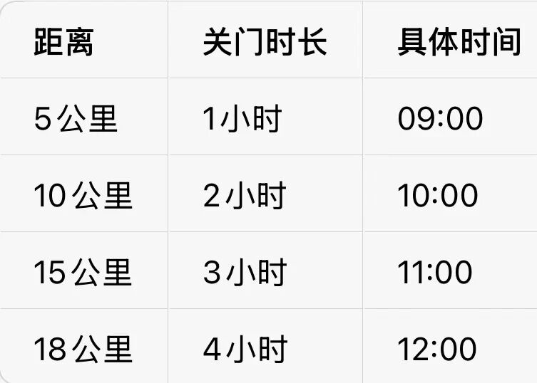3.为了保证选手者选手安全和道路交 通秩序。选手路线各段专设了关门时间, 到了关门时间,相应路段将恢复社会交通。在规定关门时间内,未完成对应距离 的选手者须立即停止选手退出线路,以免发生危险。退出选手的选手者可搭乘沿途的收容车抵达终点。 关门距离和时间(以8:00发令枪声时间为准)具体见下表: