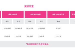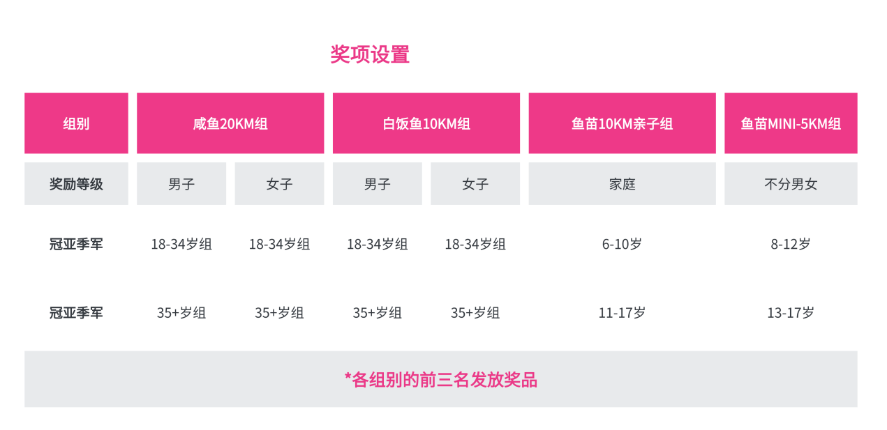 2) 鱼苗亲子组各年龄段前3名团队可获得奖励,排名不分男女;如该年龄段报名组数低于6组,则只奖励第1名;