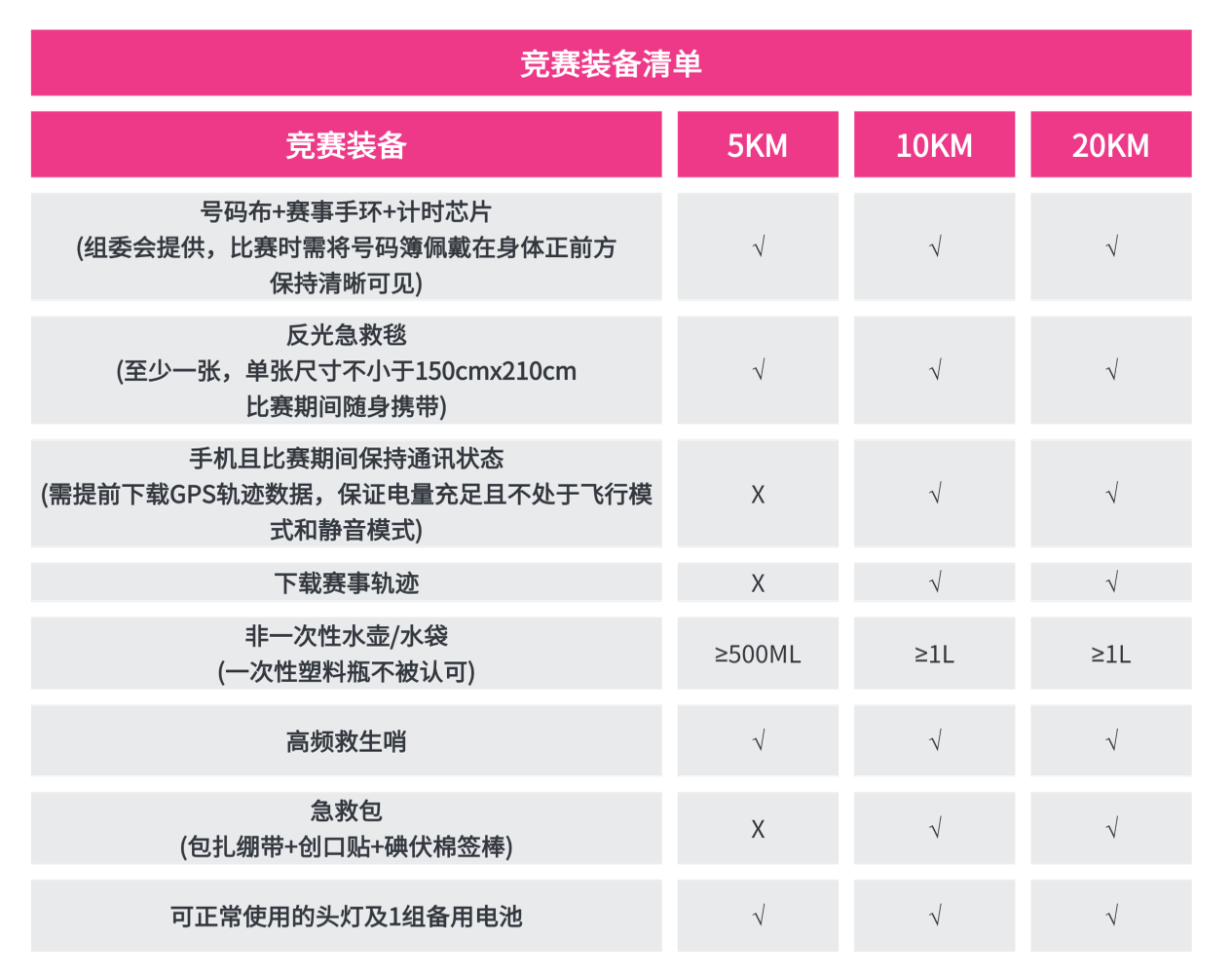 注:组委会要求20KM组选手在赛前领物报到时需要提供半年内二级甲等及以上医院或正规专业医疗机构符合组委会要求的体检报告的原件、复印件或电子版(包括但不限于:静态心率、心电图、血压),没有按要求提供体检报告的20KM组选手,组委会有权取消该选手的参赛资格(不退还报名费,只发放选手基础参赛包物资,不提供号码簿、计时芯片等竞赛物品)。