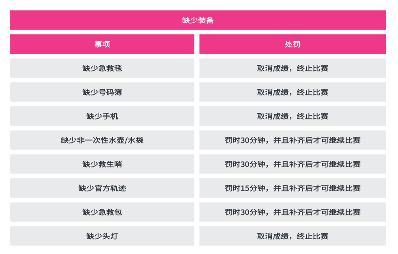 每位选手都必须在整个活动期间一直携带所有的竞赛装备(强制装备),工作人员将随机进行竞赛装备(强制装备)检查,竞赛装备(强制装备)检查不合格的选手将视情况(见下图)进行罚时或者取消参与资格。