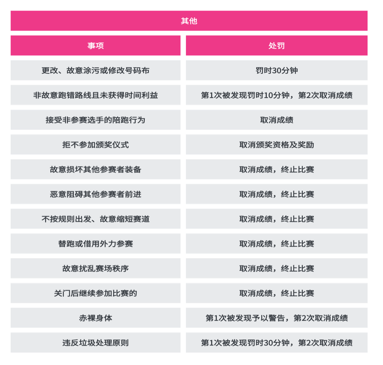 ④ 如果参赛选手无效起跑(跨批次出发、本批次发枪后10分钟出发、未经过检录区、未从待跑区出发等),不会被叫停,裁判将赛后取消其参赛成绩,并有可能追加处罚。