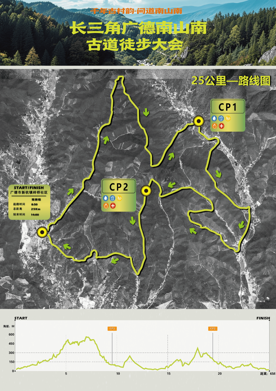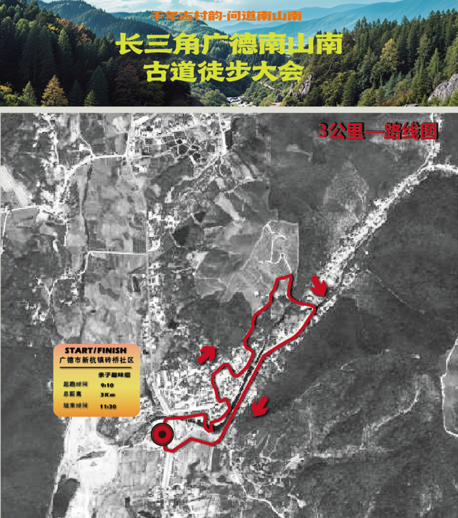 本次赛事在广德市新杭镇砖桥社区委会处设置起终点,赛道路况主要为现有沥青/水泥道路、步道及原状土路等。竞赛组进行25公里环线跑,大众徒步组进行10公里环线跑,亲子趣味组进行3公里内环跑。(亲子趣味组途中设有 3个与砖桥古村落相关的亲子任务打卡点,每个点完成任务后可获得一枚“打卡印章”,集齐印章后到终点兑换奖励)。