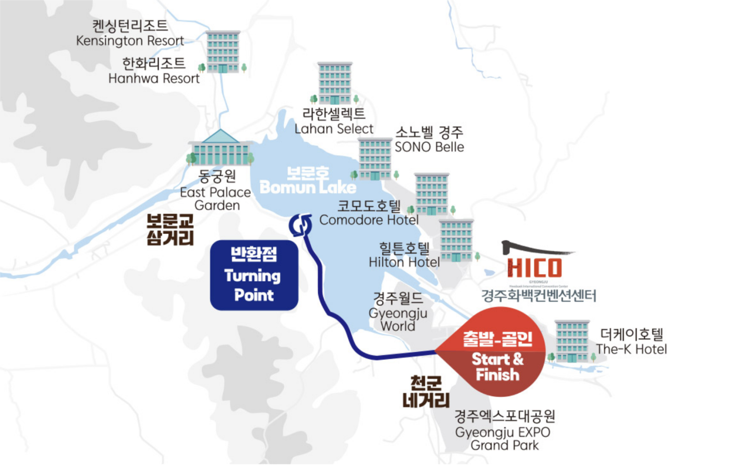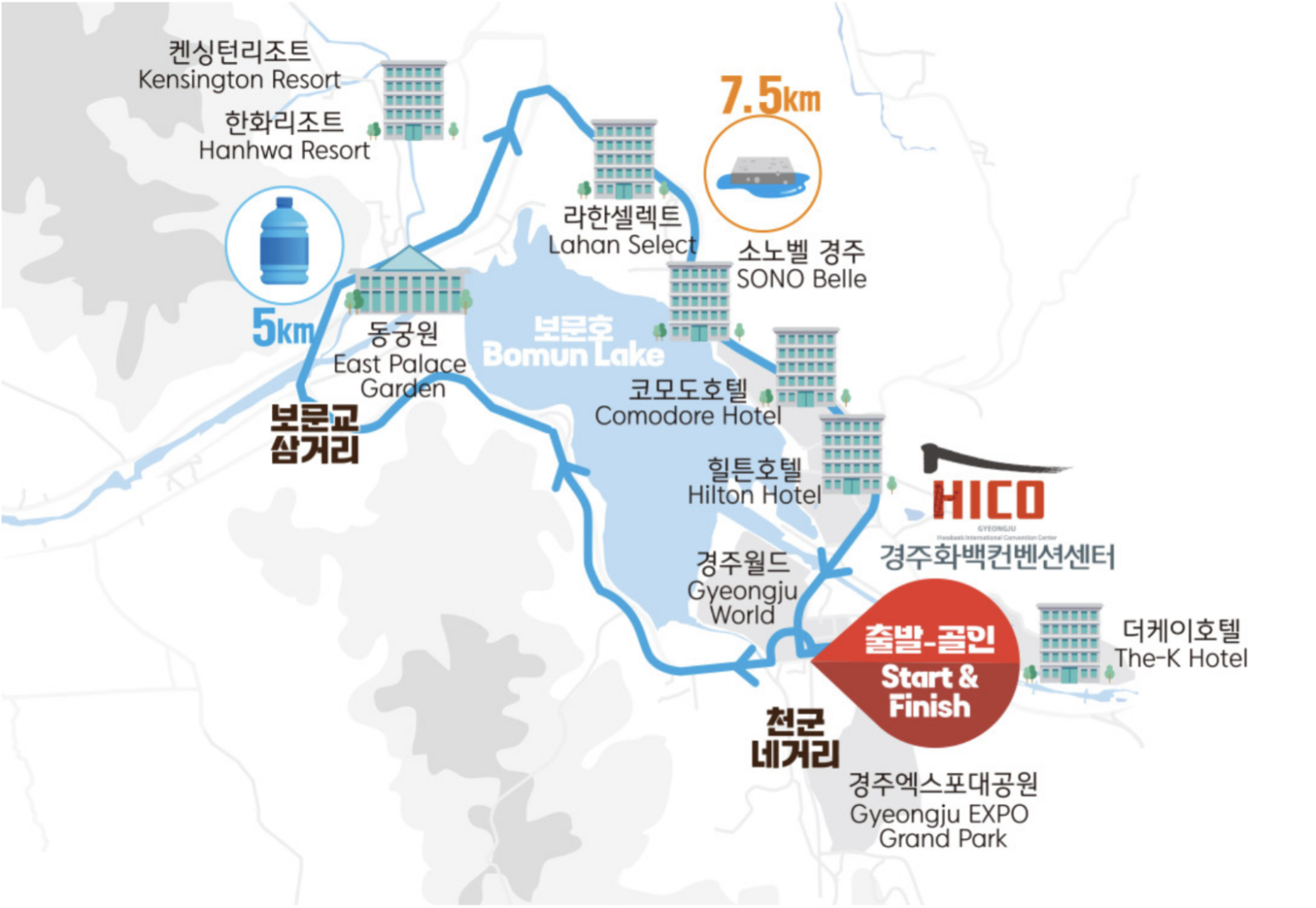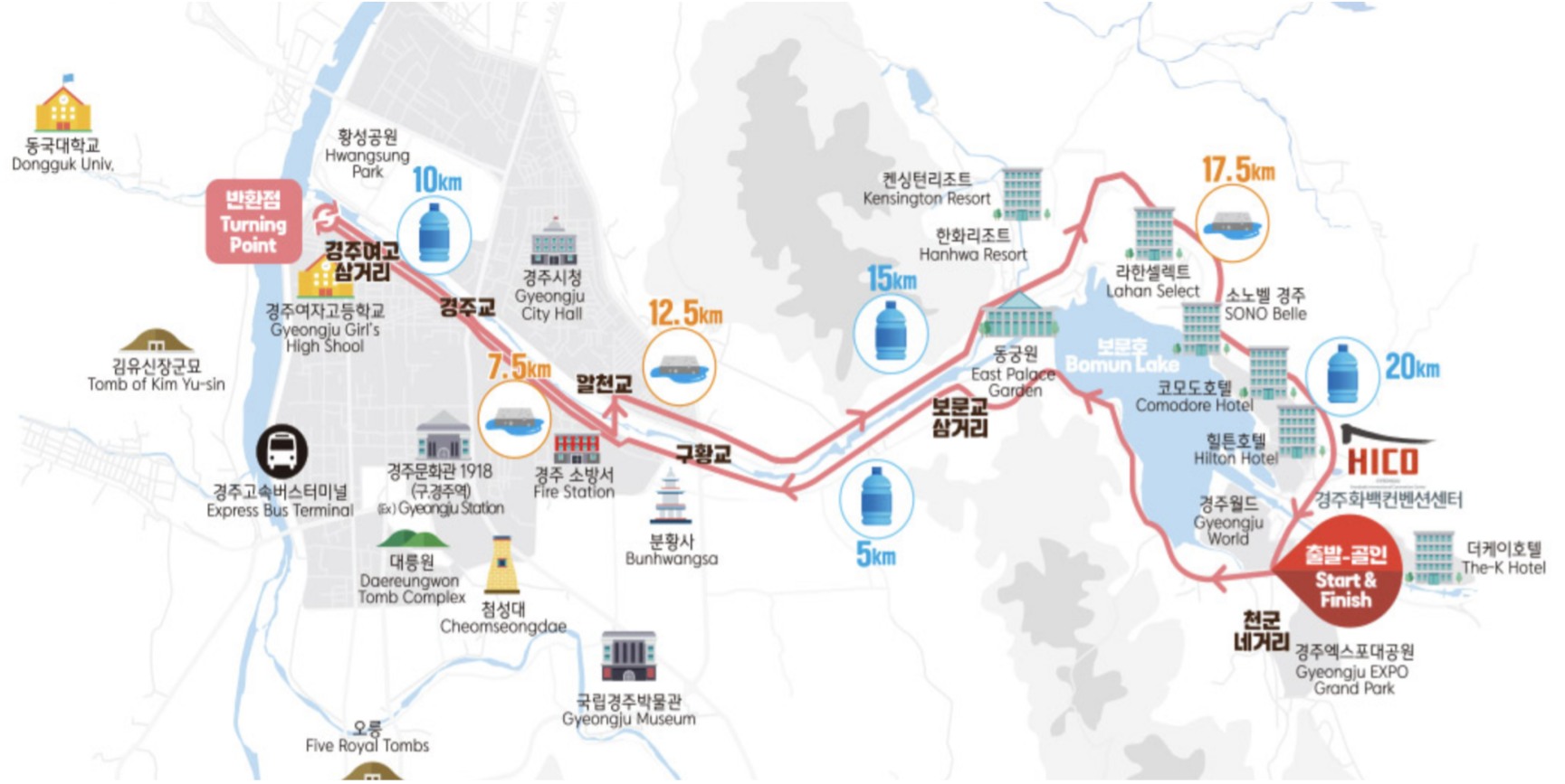 赛事终点:半程马拉松、10KM、5KM--均在普德洞居民服务中心旁边的直升机场(보덕동행정복지센터 옆 헬기장)