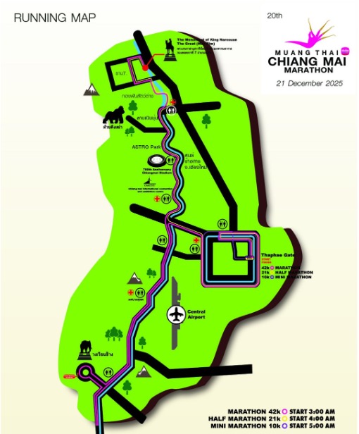 丰富多样的赛道体验:马拉松的起点位于古城佩塔门附近,赛道最初几公里绕着清迈古城墙奔跑,跑者可以感受古老城墙的历史韵味。全马选手还能跑进拉查帕花园,欣赏满眼翠绿的皇家园林与精雕细琢的泰式建筑。此外,赛道还会经过素贴山脚下,全马选手在 30 公里处能欣赏到素贴山日出的美景。