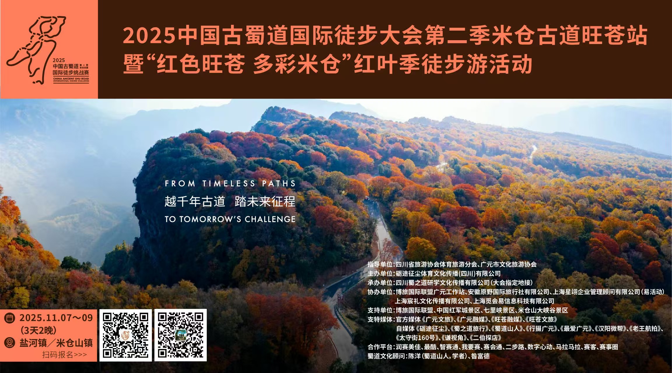 越千年古道  踏未来征程 ”中国古蜀道国际徒步大会第二季米仓古道(旺苍站)暨“红色旺苍 多彩米仓”红叶季徒步活动 人生就像徒步重要的不是终点而是沿途的风景和向前迈出的每一步这个秋天让我们一起踏上征程在行走中寻找更好的自己        发现最美的风景日升月落 斗转星移又一个十月即将款款而来秋风起 彩林显 古道无言“此生必赏,最美红叶”中国古蜀道国际徒步大会米仓古道旺苍站如约而至!一、活动组织1、指导单位四川...
