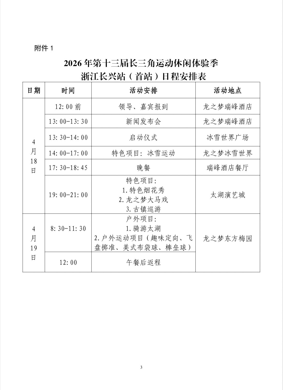 推动运动休闲产业发展,促进体育与旅游的深度融合,弘扬传播健康向上的体育文化理念,2026第十三届长三角运动休闲体验季由浙江省体育局、上海市体育局、江苏省体育局、安徽省体育局联合主办。